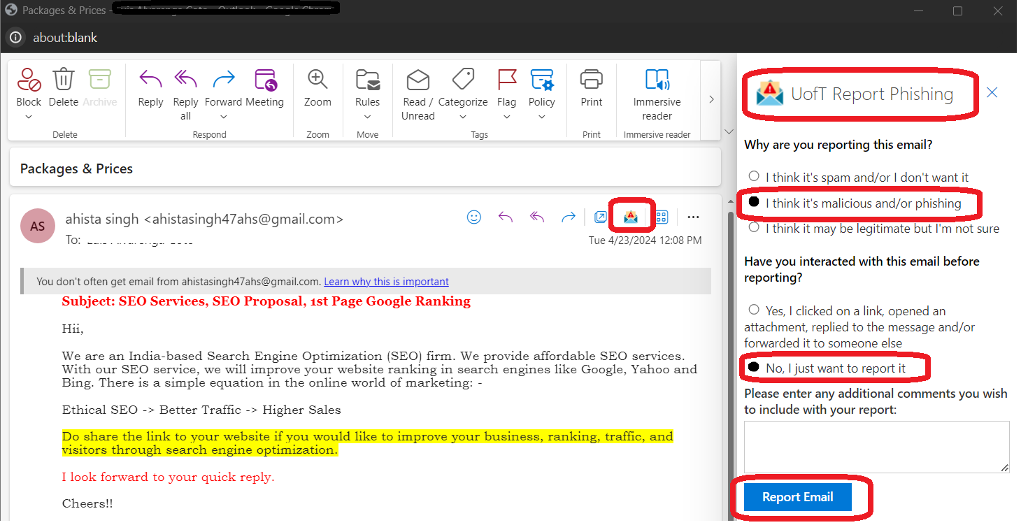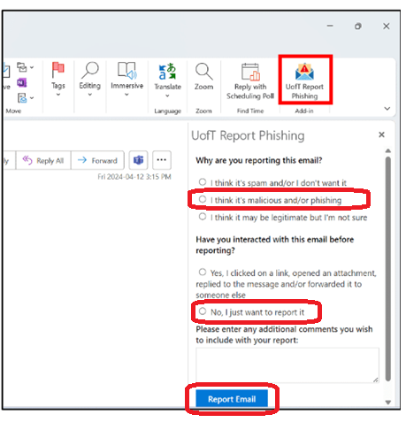 - UofT Report Phishing button: If you use Microsoft Outlook, look for the "UofT Report Phishing" button within the email interface and click it to report the email.