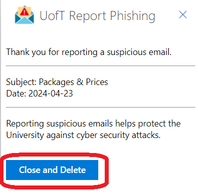 - Select “Close and Delete” to delete the suspicious message after reporting it.