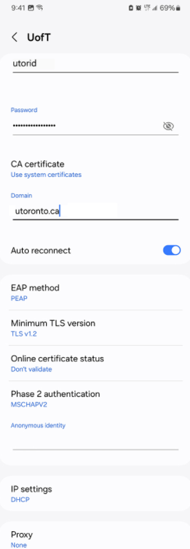 2. Connect to UofT with these exact settings: