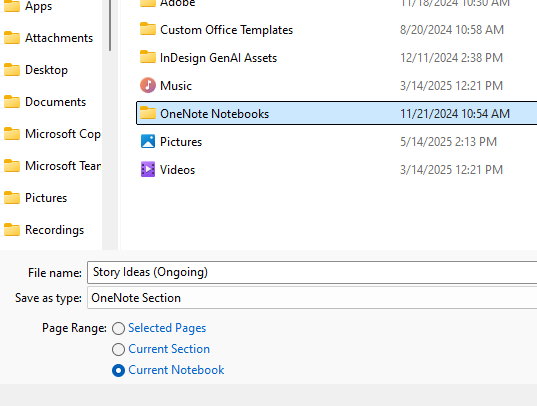 4. Save the exported file to a new folder on your personal computer. You can choose whether to export specific pages, sections, or the entire notebook under the "Page Range" option in your export/Save As window.
