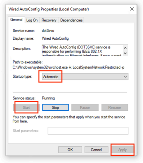 3. In the "Wired AutoConfig" dialog, select Automatic for the Startup type:, then click Start, followed by Apply, and finally, OK.