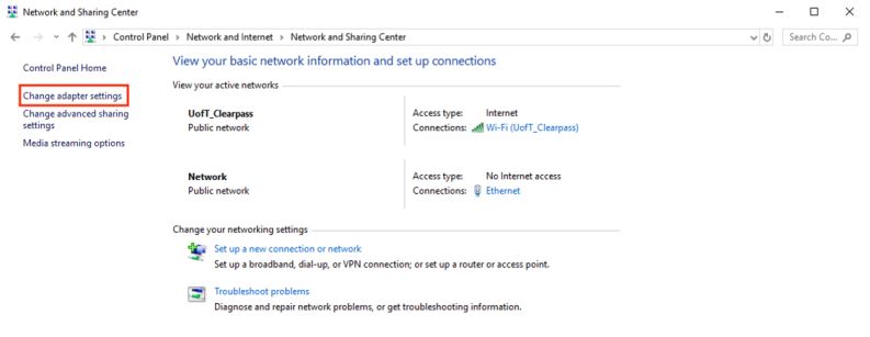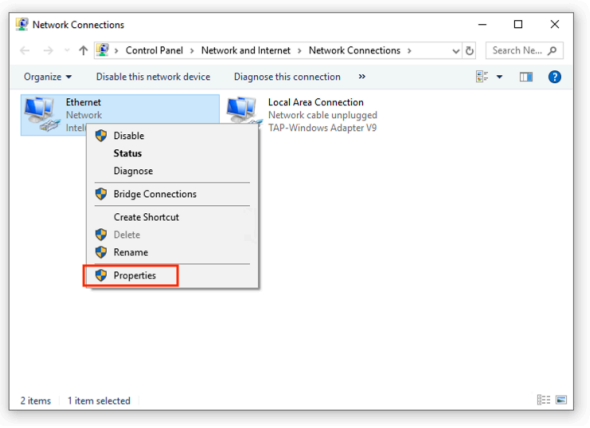 7. From the "Network Connections" dialog, select the wired network connection from the list. It is usually labeled "Ethernet" or "Local Area Connections". Then, select Properties.