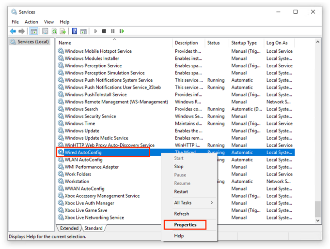 2. Scroll down to Wired AutoConfig from the list, then right-click on it and choose Properties.